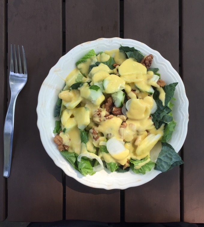 I decided for a salad with equal amounts of kale and romaine, Cipollini onion (pronounced chip-oh-lee-knee), small cucumber and generous amount of almonds.
