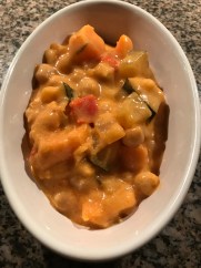 One year later I noticed a container in the freezer labelled “Chickpea curry thing”. “Hmmm, this sounds good”. After thawing it overnight, a bit of water was added as I reheated it and OMG! This dish served as a perfect lunch for 3 servings. Adding the water made it a bit more like a soup.