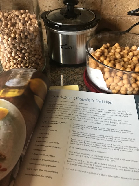 In planning out the meals for the week, page 81 in my Blue Zones book, same page that carries the quote above, there is a recipe for a yummy Meatless Monday…….Chickpea Falafel.