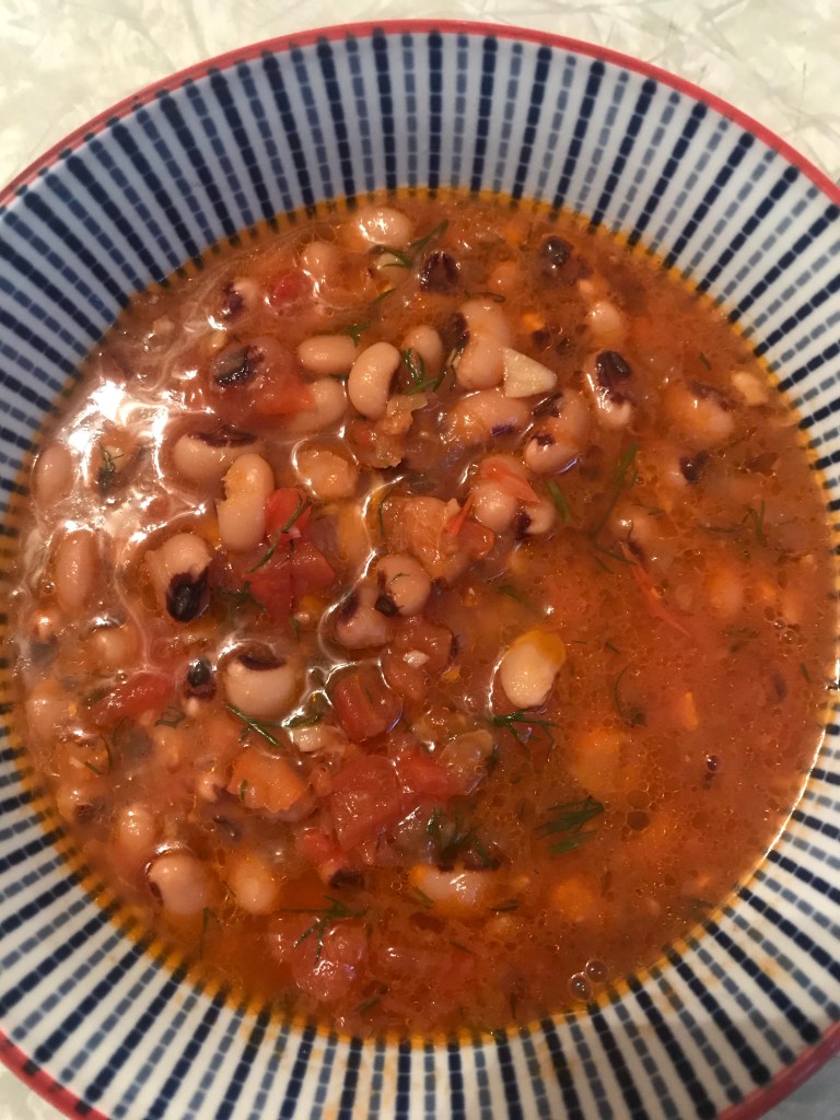 Add the chopped dill and season with salt to taste. Continue cooking until the black-eyed peas are tender – about 20 minutes.